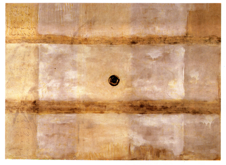 oil, tar, wax, acrylic, steel ball and canvas on panel